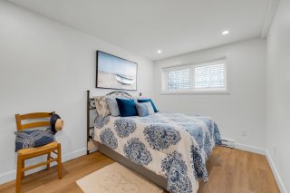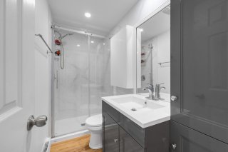 Deux chambres de bonnes dimensions avec grandes fenêtres et atmosphère lumineuse et apaisante Salle de bain rénovée avec douche vitrée et céramique effet marbre au mur Vanité moderne et solutions de rangement bien pensées