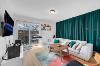 Salon chaleureux et invitant comprenant... Plancher effet bois qui s'harmonise parfaitement à l'ensemble de l'espace Grande porte-patio coulissante créant une ambiance lumineuse et aérée Rideaux pleine hauteur ajoutant une touche élégante et raffinée Étagères intégrées, idéales pour le rangement et la mise en valeur